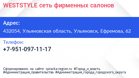 WESTSTYLE, сеть фирменных салонов по адресу 432054, Ульяновская область, Ульяновск, Ефремова, 62 в дальнейшем Организация, размещена в следующих категориях:
