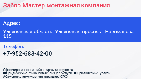 Забор Мастер, монтажная компания по адресу Ульяновская область, Ульяновск, проспект Нариманова, 115 в дальнейшем Организация, размещена в следующих категориях: