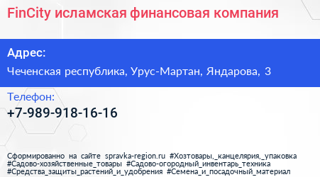 FinCity, исламская финансовая компания по адресу Чеченская республика, Урус-Мартан, Яндарова, 3 в дальнейшем Организация, размещена в следующих категориях: