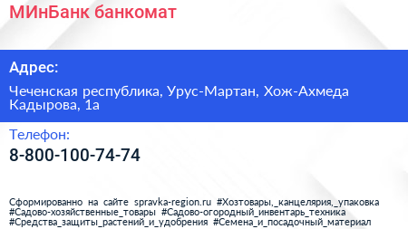 МИнБанк, банкомат по адресу Чеченская республика, Урус-Мартан, Хож-Ахмеда Кадырова, 1а в дальнейшем Организация, размещена в следующих категориях: