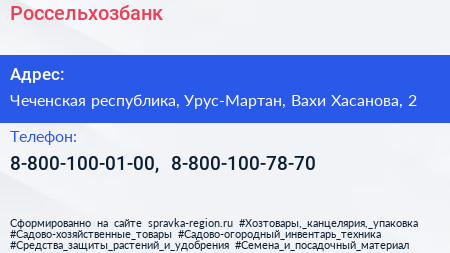 Россельхозбанк по адресу Чеченская республика, Урус-Мартан, Вахи Хасанова, 2 в дальнейшем Организация, размещена в следующих категориях:
