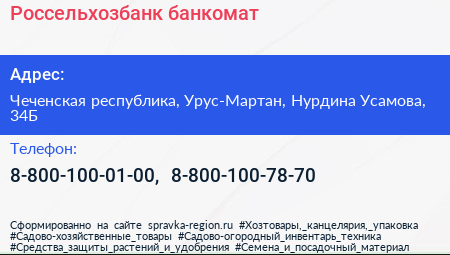 Россельхозбанк, банкомат по адресу Чеченская республика, Урус-Мартан, Нурдина Усамова, 34Б в дальнейшем Организация, размещена в следующих категориях: