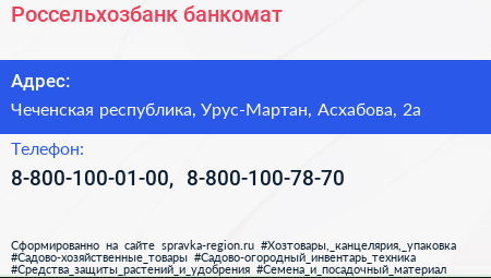Россельхозбанк, банкомат по адресу Чеченская республика, Урус-Мартан, Асхабова, 2а в дальнейшем Организация, размещена в следующих категориях: