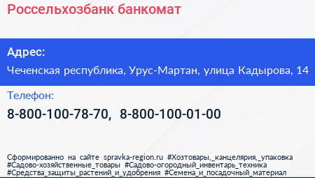 Россельхозбанк, банкомат по адресу Чеченская республика, Урус-Мартан, улица Кадырова, 14 в дальнейшем Организация, размещена в следующих категориях:
