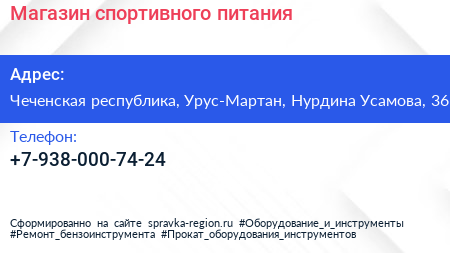 Магазин спортивного питания по адресу Чеченская республика, Урус-Мартан, Нурдина Усамова, 36 в дальнейшем Организация, размещена в следующих категориях: