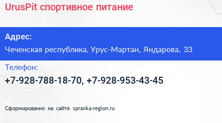 UrusPit, спортивное питание по адресу Чеченская республика, Урус-Мартан, Яндарова, 33 в дальнейшем Организация, размещена в следующих категориях: