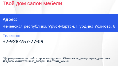 Твой дом, салон мебели по адресу Чеченская республика, Урус-Мартан, Нурдина Усамова, 8 в дальнейшем Организация, размещена в следующих категориях: