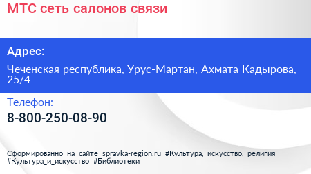 МТС, сеть салонов связи по адресу Чеченская республика, Урус-Мартан, Ахмата Кадырова, 25/4 в дальнейшем Организация, размещена в следующих категориях: