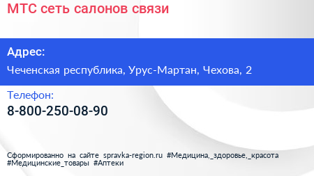 МТС, сеть салонов связи по адресу Чеченская республика, Урус-Мартан, Чехова, 2 в дальнейшем Организация, размещена в следующих категориях: