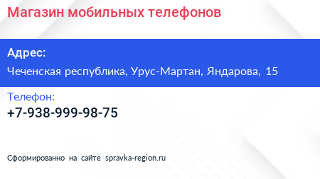Магазин мобильных телефонов по адресу Чеченская республика, Урус-Мартан, Яндарова, 15 в дальнейшем Организация, размещена в следующих категориях: