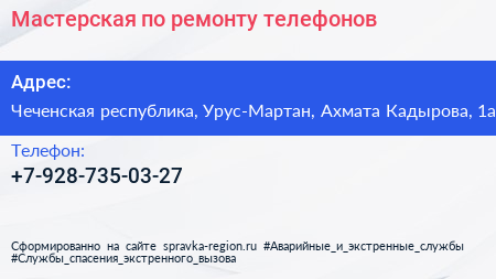 Мастерская по ремонту телефонов по адресу Чеченская республика, Урус-Мартан, Ахмата Кадырова, 1а в дальнейшем Организация, размещена в следующих категориях: