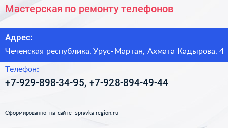 Мастерская по ремонту телефонов по адресу Чеченская республика, Урус-Мартан, Ахмата Кадырова, 4 в дальнейшем Организация, размещена в следующих категориях: