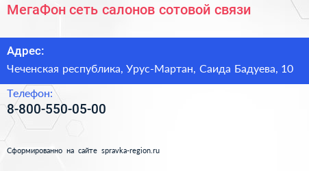 МегаФон, сеть салонов сотовой связи по адресу Чеченская республика, Урус-Мартан, Саида Бадуева, 10 в дальнейшем Организация, размещена в следующих категориях: