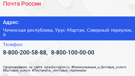 Почта России по адресу Чеченская республика, Урус-Мартан, Северный переулок, 6 в дальнейшем Организация, размещена в следующих категориях: