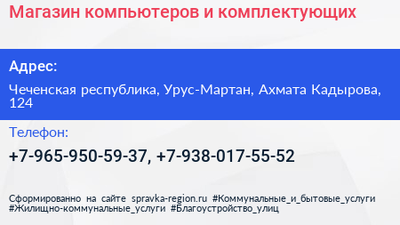 Магазин компьютеров и комплектующих по адресу Чеченская республика, Урус-Мартан, Ахмата Кадырова, 124 в дальнейшем Организация, размещена в следующих категориях: