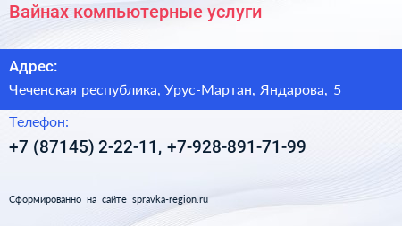 Вайнах, компьютерные услуги по адресу Чеченская республика, Урус-Мартан, Яндарова, 5 в дальнейшем Организация, размещена в следующих категориях: