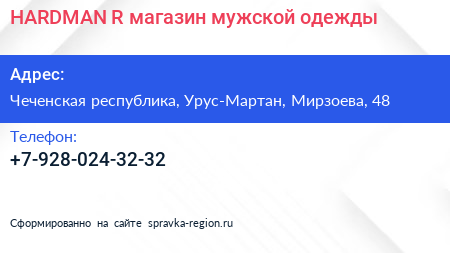 HARDMAN.R, магазин мужской одежды по адресу Чеченская республика, Урус-Мартан, Мирзоева, 48 в дальнейшем Организация, размещена в следующих категориях: