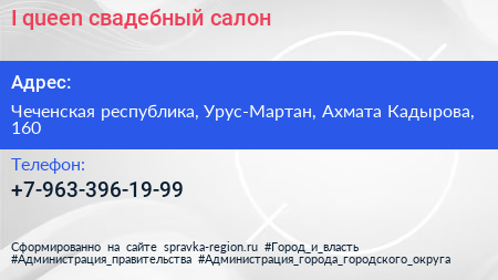 I queen, свадебный салон по адресу Чеченская республика, Урус-Мартан, Ахмата Кадырова, 160 в дальнейшем Организация, размещена в следующих категориях: