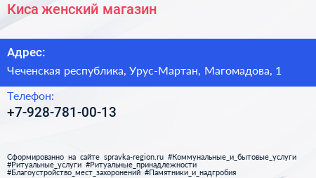 Киса, женский магазин по адресу Чеченская республика, Урус-Мартан, Магомадова, 1 в дальнейшем Организация, размещена в следующих категориях: