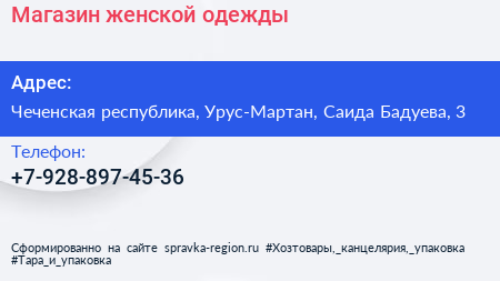 Магазин женской одежды по адресу Чеченская республика, Урус-Мартан, Саида Бадуева, 3 в дальнейшем Организация, размещена в следующих категориях: