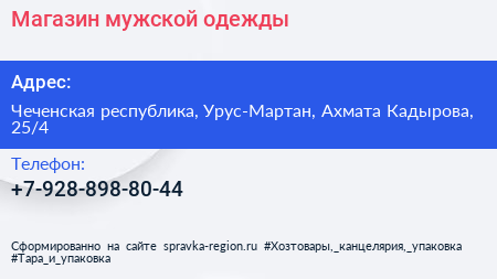 Магазин мужской одежды по адресу Чеченская республика, Урус-Мартан, Ахмата Кадырова, 25/4 в дальнейшем Организация, размещена в следующих категориях: