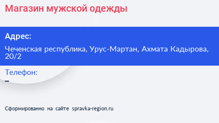 Магазин мужской одежды по адресу Чеченская республика, Урус-Мартан, Ахмата Кадырова, 20/2 в дальнейшем Организация, размещена в следующих категориях:
