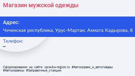 Магазин мужской одежды по адресу Чеченская республика, Урус-Мартан, Ахмата Кадырова, 8 в дальнейшем Организация, размещена в следующих категориях: