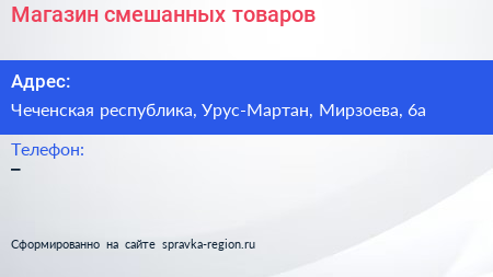 Магазин смешанных товаров по адресу Чеченская республика, Урус-Мартан, Мирзоева, 6а в дальнейшем Организация, размещена в следующих категориях: