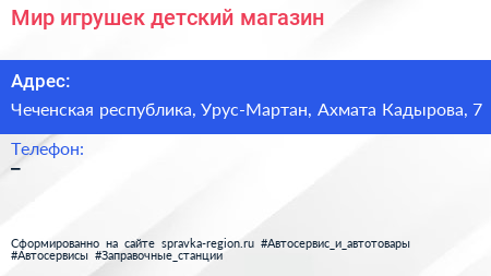 Мир игрушек, детский магазин по адресу Чеченская республика, Урус-Мартан, Ахмата Кадырова, 7 в дальнейшем Организация, размещена в следующих категориях: