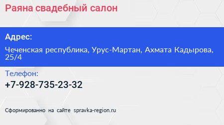 Раяна, свадебный салон по адресу Чеченская республика, Урус-Мартан, Ахмата Кадырова, 25/4 в дальнейшем Организация, размещена в следующих категориях: