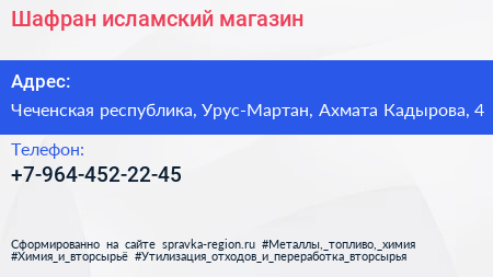 Шафран, исламский магазин по адресу Чеченская республика, Урус-Мартан, Ахмата Кадырова, 4 в дальнейшем Организация, размещена в следующих категориях: