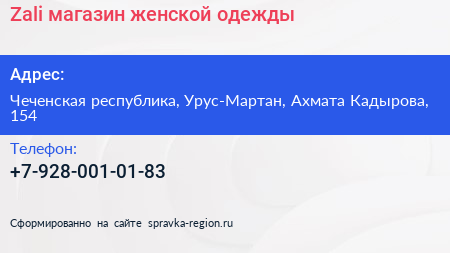Zali, магазин женской одежды по адресу Чеченская республика, Урус-Мартан, Ахмата Кадырова, 154 в дальнейшем Организация, размещена в следующих категориях:
