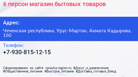 6 персон, магазин бытовых товаров по адресу Чеченская республика, Урус-Мартан, Ахмата Кадырова, 160 в дальнейшем Организация, размещена в следующих категориях: