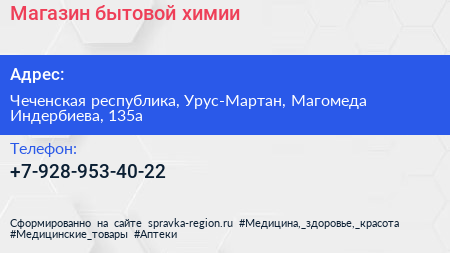 Магазин бытовой химии по адресу Чеченская республика, Урус-Мартан, Магомеда Индербиева, 135а в дальнейшем Организация, размещена в следующих категориях: