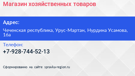 Магазин хозяйственных товаров по адресу Чеченская республика, Урус-Мартан, Нурдина Усамова, 16а в дальнейшем Организация, размещена в следующих категориях: