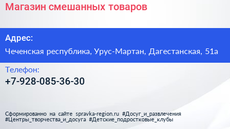 Магазин смешанных товаров по адресу Чеченская республика, Урус-Мартан, Дагестанская, 51а в дальнейшем Организация, размещена в следующих категориях: