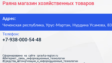 Раяна, магазин хозяйственных товаров по адресу Чеченская республика, Урус-Мартан, Нурдина Усамова, 83 в дальнейшем Организация, размещена в следующих категориях: