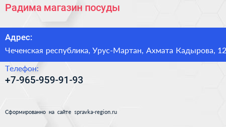 Радима, магазин посуды по адресу Чеченская республика, Урус-Мартан, Ахмата Кадырова, 12 в дальнейшем Организация, размещена в следующих категориях:
