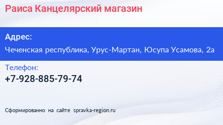 Раиса, Канцелярский магазин по адресу Чеченская республика, Урус-Мартан, Юсупа Усамова, 2а в дальнейшем Организация, размещена в следующих категориях: