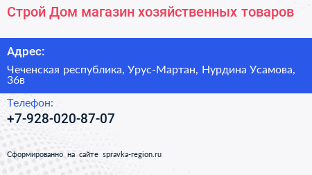 Строй Дом, магазин хозяйственных товаров по адресу Чеченская республика, Урус-Мартан, Нурдина Усамова, 36в в дальнейшем Организация, размещена в следующих категориях: