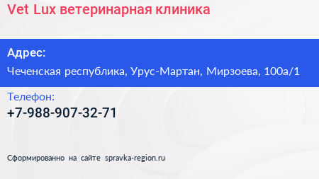 Vet-Lux, ветеринарная клиника по адресу Чеченская республика, Урус-Мартан, Мирзоева, 100а/1 в дальнейшем Организация, размещена в следующих категориях: