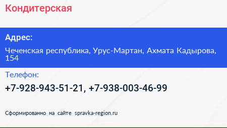 Кондитерская по адресу Чеченская республика, Урус-Мартан, Ахмата Кадырова, 154 в дальнейшем Организация, размещена в следующих категориях: