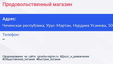 Продовольственный магазин по адресу Чеченская республика, Урус-Мартан, Нурдина Усамова, 50 в дальнейшем Организация, размещена в следующих категориях: