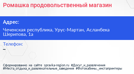 Ромашка, продовольственный магазин по адресу Чеченская республика, Урус-Мартан, Асланбека Шерипова, 1а в дальнейшем Организация, размещена в следующих категориях: