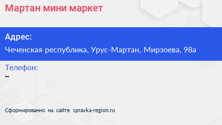 Мартан, мини-маркет по адресу Чеченская республика, Урус-Мартан, Мирзоева, 98а в дальнейшем Организация, размещена в следующих категориях: