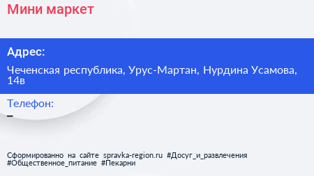 Мини-маркет по адресу Чеченская республика, Урус-Мартан, Нурдина Усамова, 14в в дальнейшем Организация, размещена в следующих категориях: