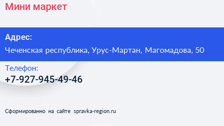 Мини-маркет по адресу Чеченская республика, Урус-Мартан, Магомадова, 50 в дальнейшем Организация, размещена в следующих категориях: