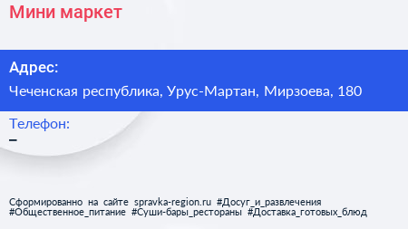 Мини-маркет по адресу Чеченская республика, Урус-Мартан, Мирзоева, 180 в дальнейшем Организация, размещена в следующих категориях: