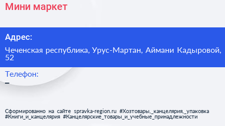 Мини-маркет по адресу Чеченская республика, Урус-Мартан, Аймани Кадыровой, 52 в дальнейшем Организация, размещена в следующих категориях: