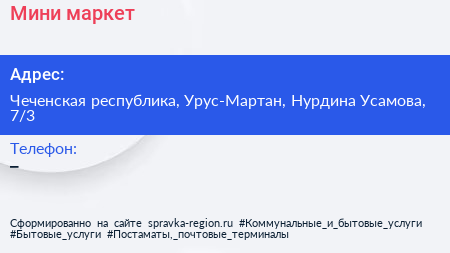 Мини-маркет по адресу Чеченская республика, Урус-Мартан, Нурдина Усамова, 7/3 в дальнейшем Организация, размещена в следующих категориях: